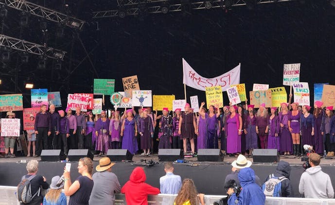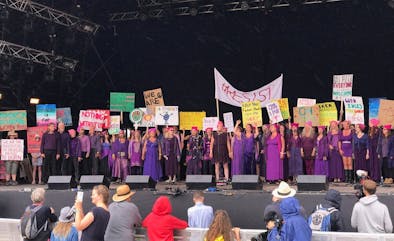 As we continued to develop our numbers grew, and so did our reputation. In 1995 we were invited by Michael Eavis to sing on the Pyramid Stage in his community slot on the Sunday morning. We’ve been invited back many times and this year we performed on the Park Stage as part of the programme for The White Ribbon Alliance.