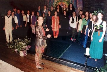It all started in the Assembly Rooms of Glastonbury, the home of so many wonderful community projects and creative happenings. It was not long before other local creative luminaries became involved, bringing their special enthusiasms and creative colours. Sue Palmer's powerful personality and natural ability to inspire and lead drew her into the position of conductor and she brought with her a passionate interest in East European harmony singing, and so began the Choir's love affair with Bulgarian folk and Georgian choral music, which continues to this day. Sue left the Choir in 1995, and I found myself stepping forward into the role of Musical Director, and I am now supported by other conductors from within the choir membership.
